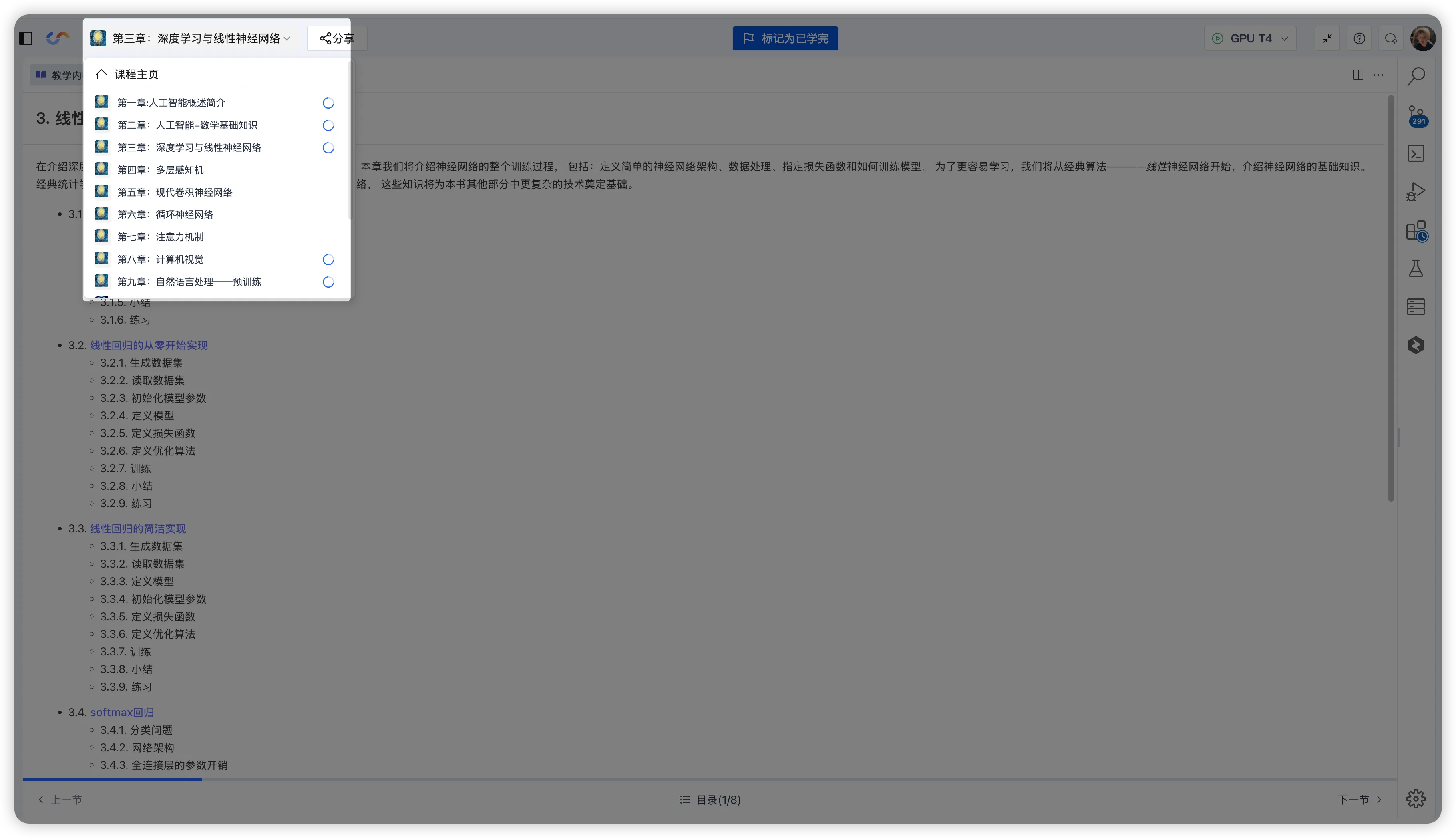 章节切换: 点击左上角章节名称展开状态栏,在下拉菜单中选择 「切换章节」 后直接选择目标章节;同时可通过章节右侧的 学习进度小图标 快速定位目标章节。