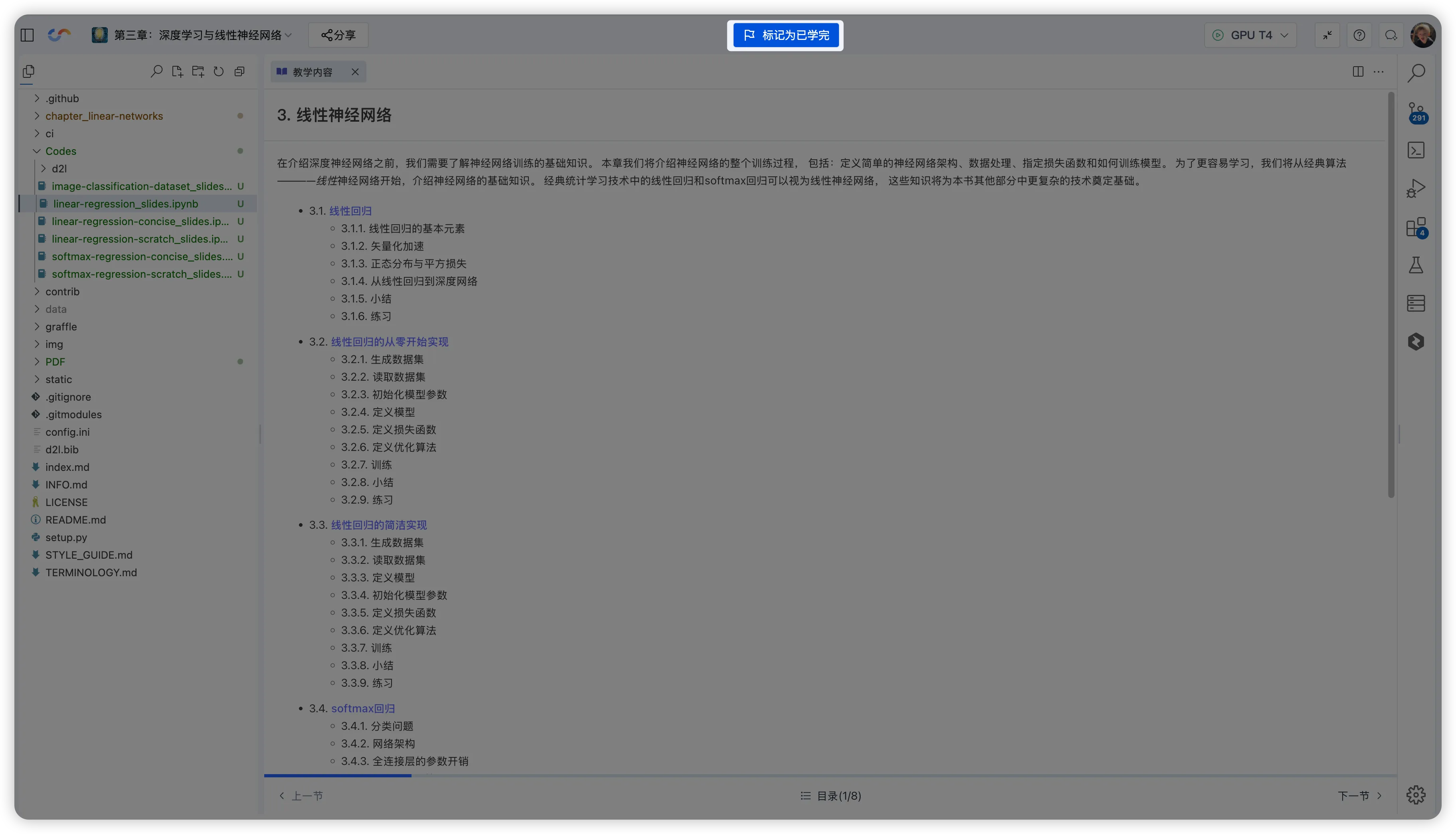 连续学习: 通过界面中的 「上一节」「下一节」 按钮实现章节无缝衔接,方便知识串联与复习。