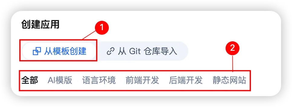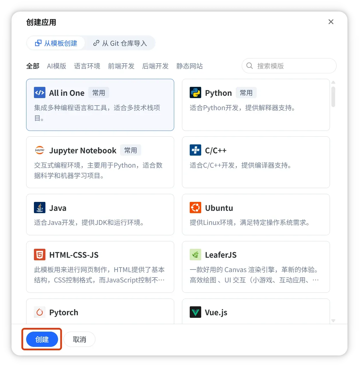 筛选模板:在模板中心页面,可按分类筛选(如 「前端」「AI」「后端」「语言环境」 )。
