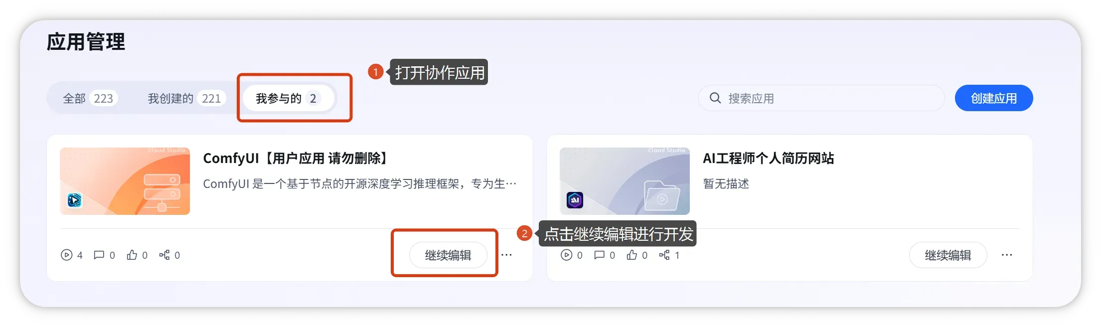 被邀请用户进入 应用管理 > 我参与的 页面,查看自己作为协作者的应用列表,点击即可进入编辑或查看。