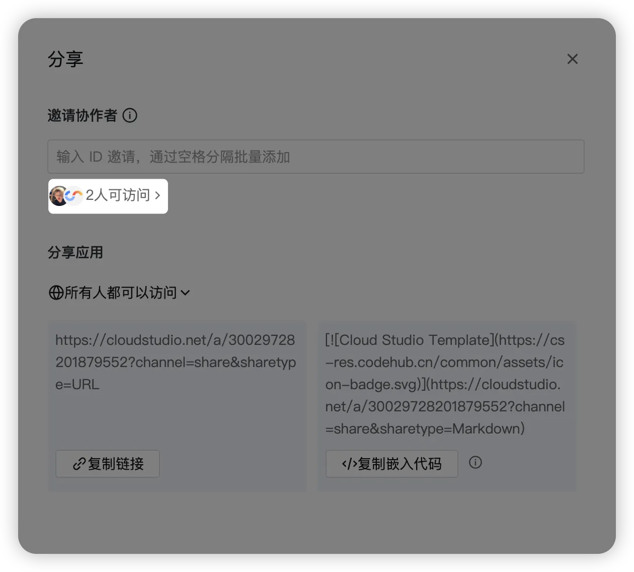 选择权限后点击 「复制链接」,将链接分享给目标用户 → 对方登录 CloudStudio 账号并打开链接,自动获得对应权限。