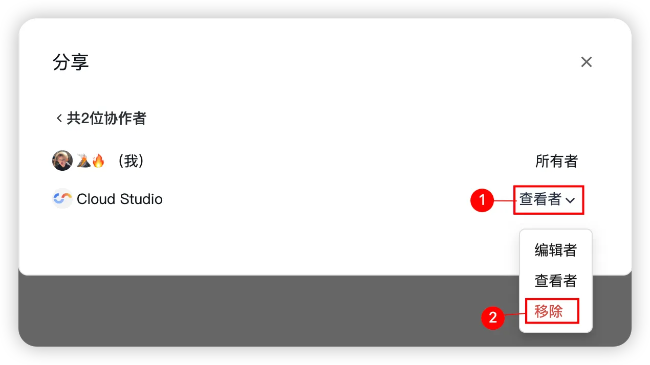 在协作者列表中找到对应用户,点击 「移除」 移除其协作权限