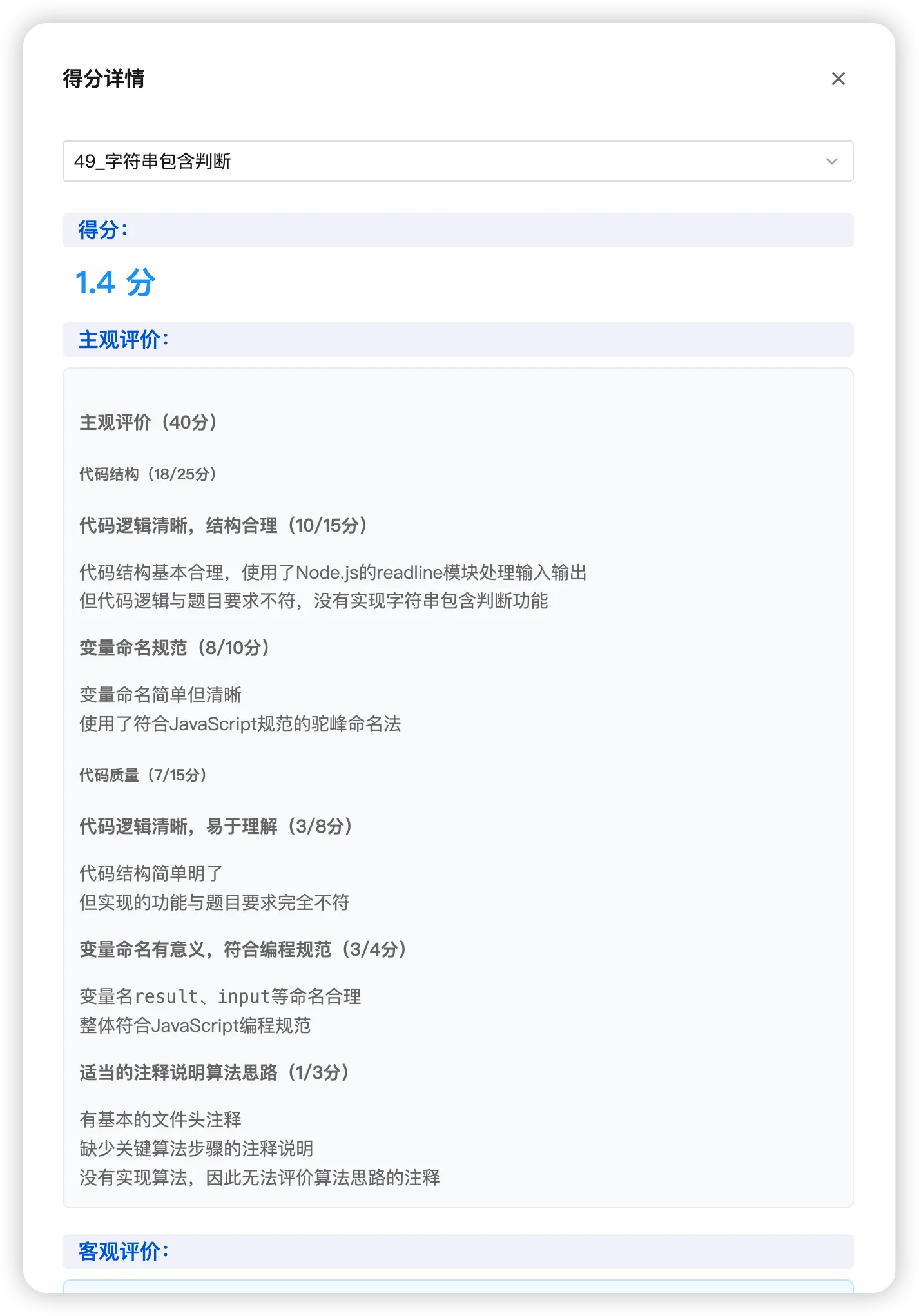 - 弹窗中会按题目拆分,显示 “知识点得分”“批改备注”“改进建议” 等内容(如 “第 1 题 - 知识点 A:3/5 分,备注:代码逻辑正确,但缺少异常处理”)。