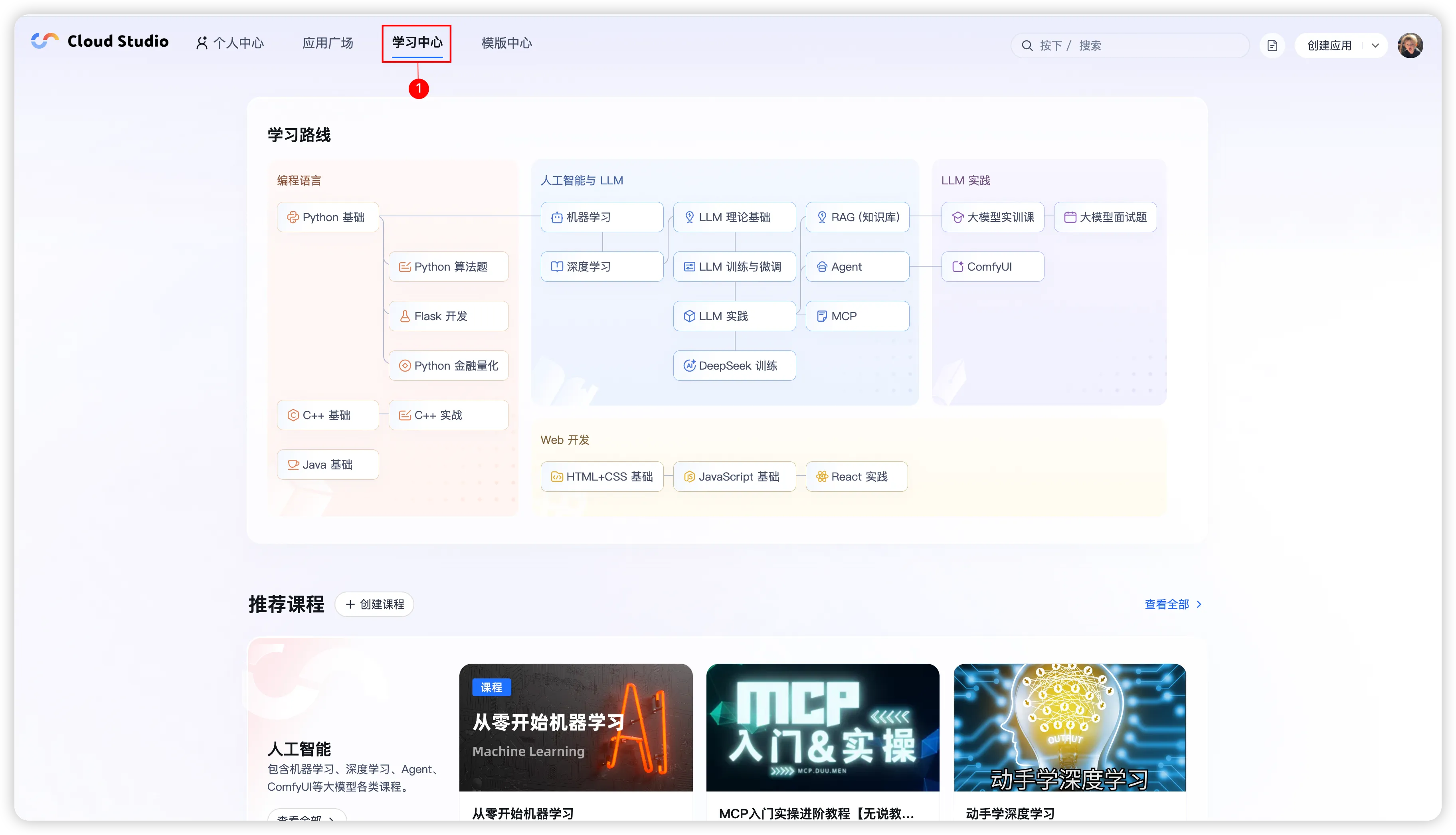 - 进入学习中心:登录成功后,在页面顶部的导航栏中找到并点击 「学习中心」,即可进入公开课程界面——可直接浏览推荐课程,或通过顶部搜索框输入课程名称关键词查找目标内容。