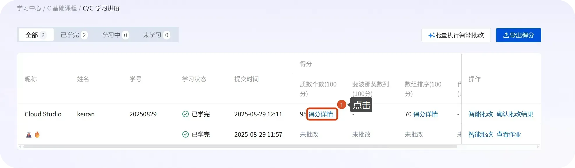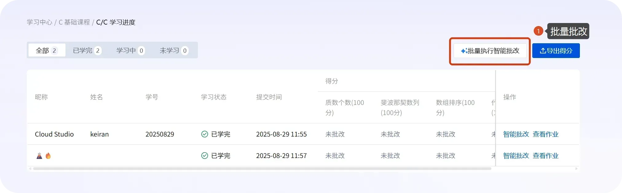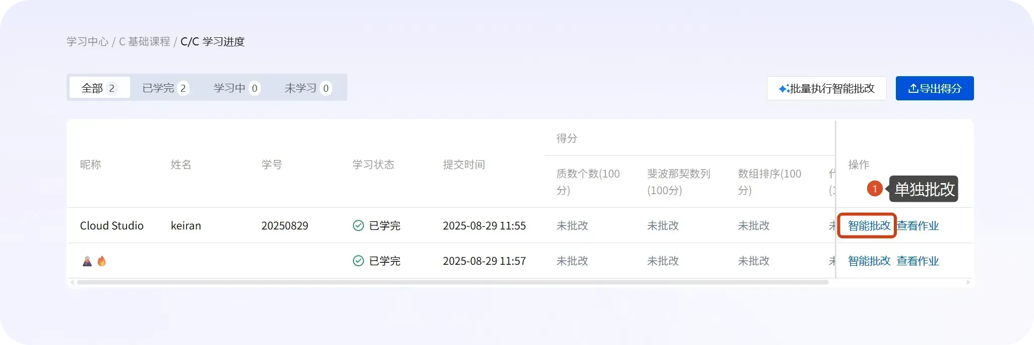 - 在学生列表中执行智能批改(单个/批量)