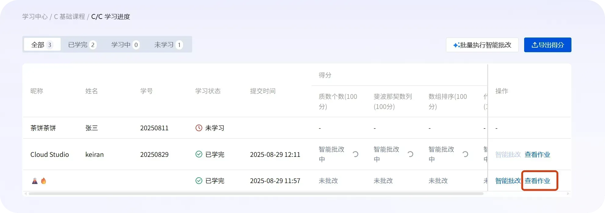 点击学生行右侧 「智能批改」