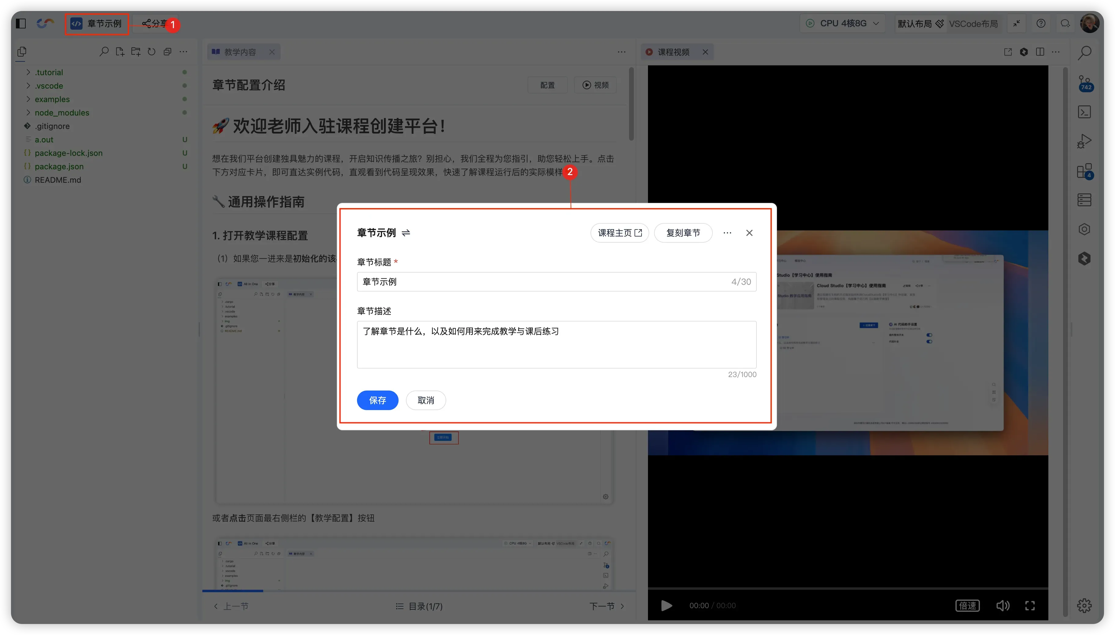- 配置教学:点 「添加小节」 → 选教案/练习文件 → 配运行命令/视频 → 保存