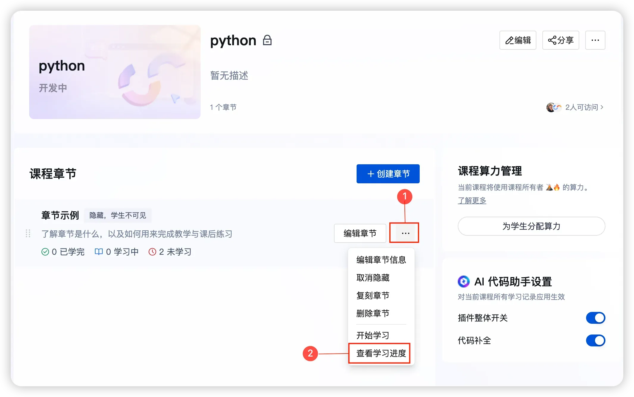 点击章节右侧 「⋯」 → 选择 「查看学习进度」。