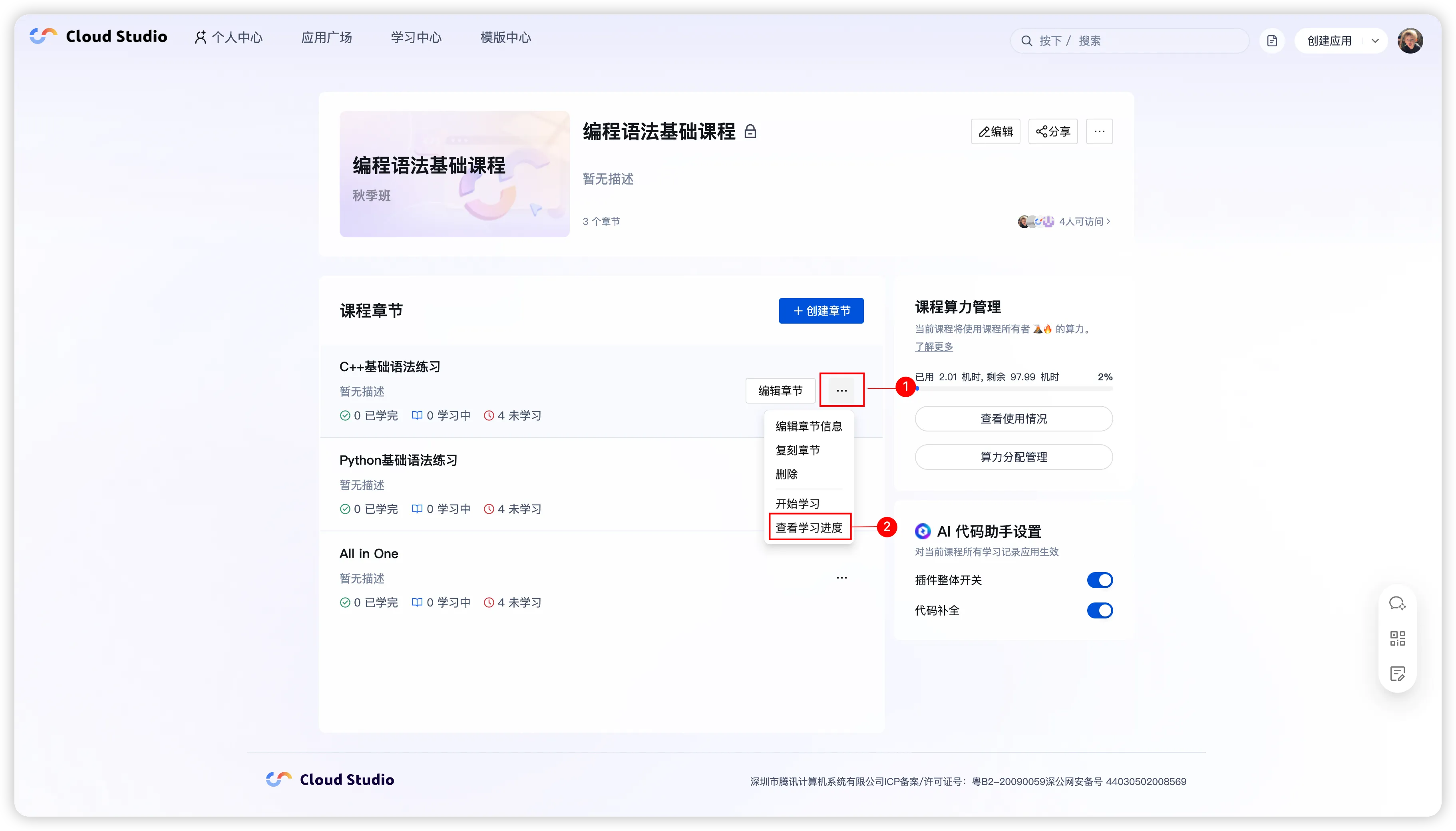 点击目标章节右侧的 「⋯」 更多选项,选择 **「查看学习进度」**。